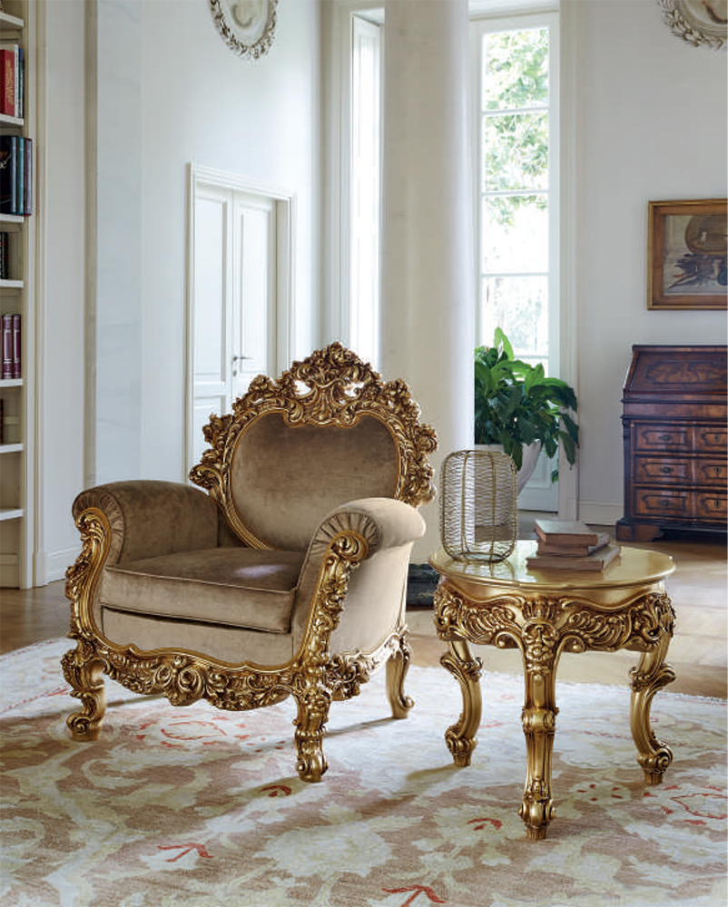 Кресло с высокой спинкой. Декор - пенополиуретан, наполнение - полиуретан. Возможны другие варианты отделки и обивки.
